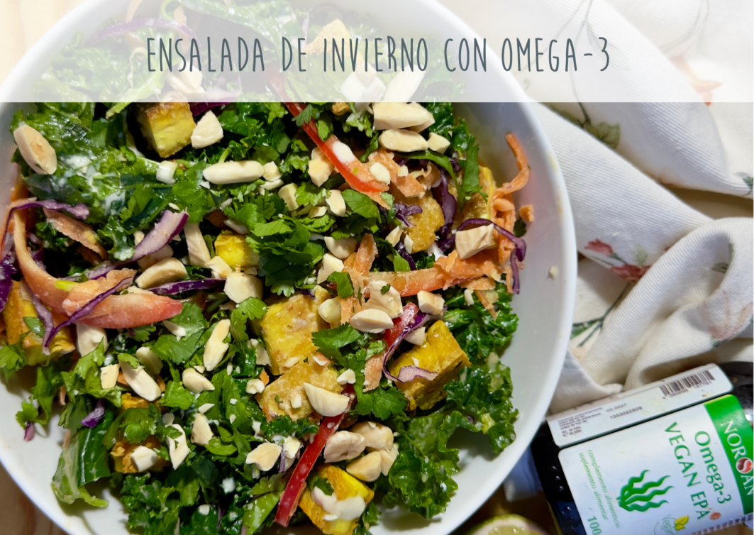 Ensalada tibia de invierno con kale, tofu dorado y aderezo cremoso de tahini con Omega-3