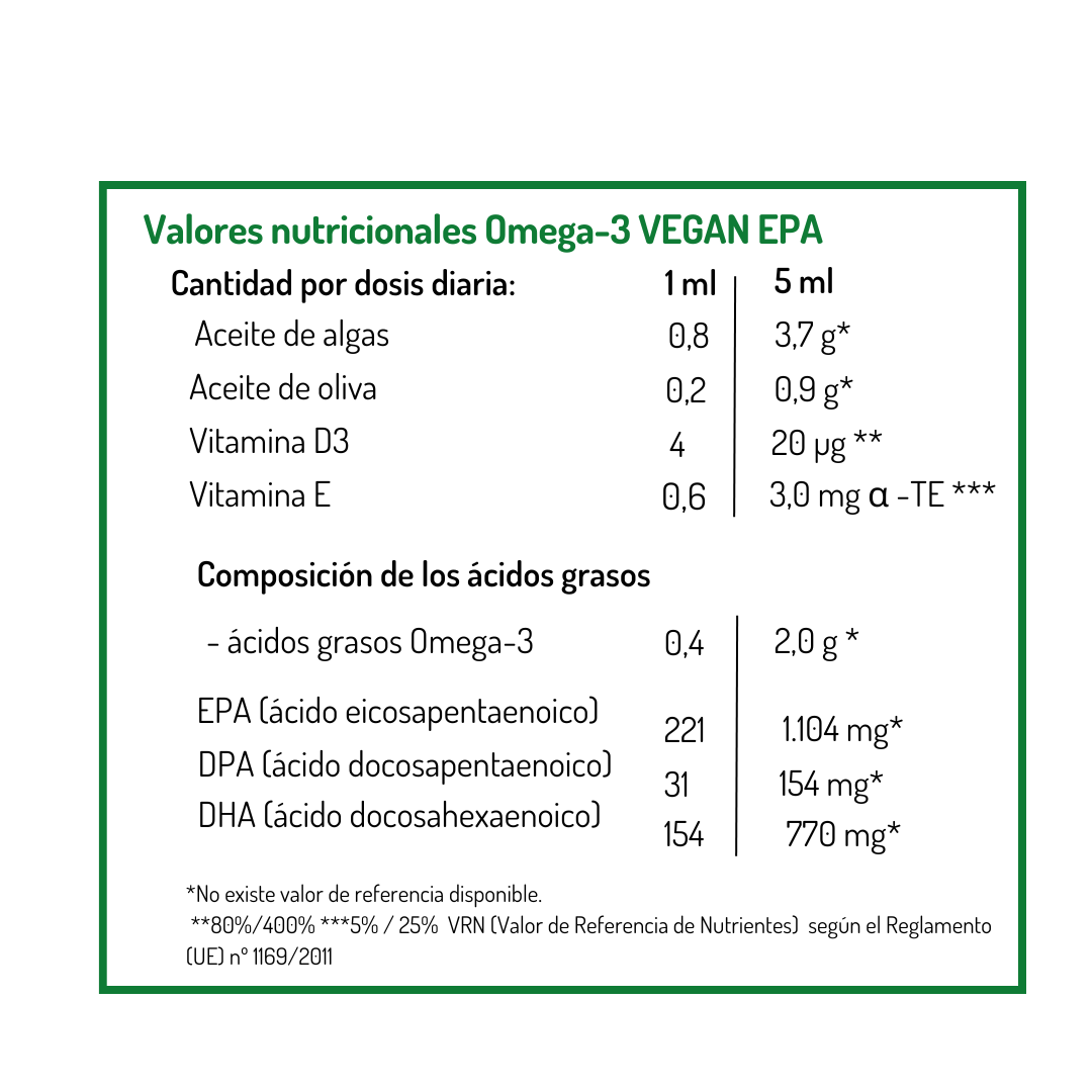 NORSAN OMEGA-3 VEGAN EPA (100 ml) consiste en una combinación única: un aceite vegetal de algas en alta dosis y un aceite de oliva virgen extra ecológico prensado en frío con un alto contenido en polifenoles. Una dosis diaria (5 ml = 1 cucharadita) aporta 2000 mg de ácidos grasos omega-3. Esta dosis diaria ha demostrado ser eficaz para mantener niveles adecuados de omega-3 en el organismo, según lo determina el Índice Omega-3 mediante el análisis de ácidos grasos.